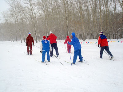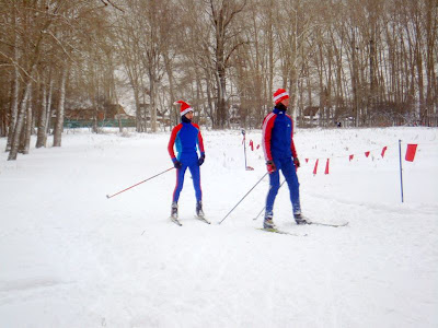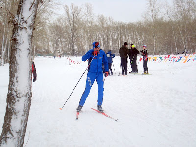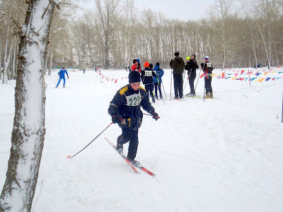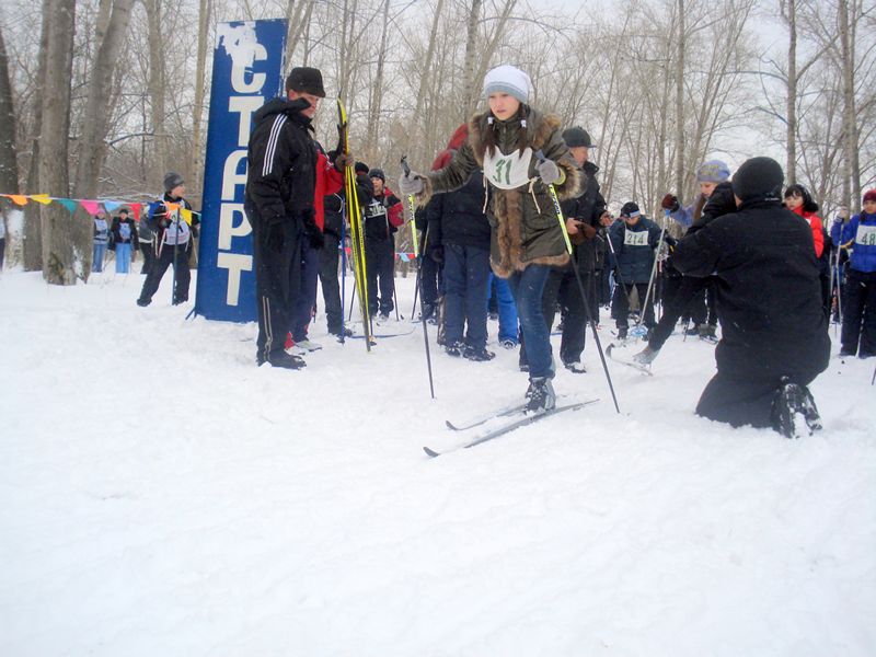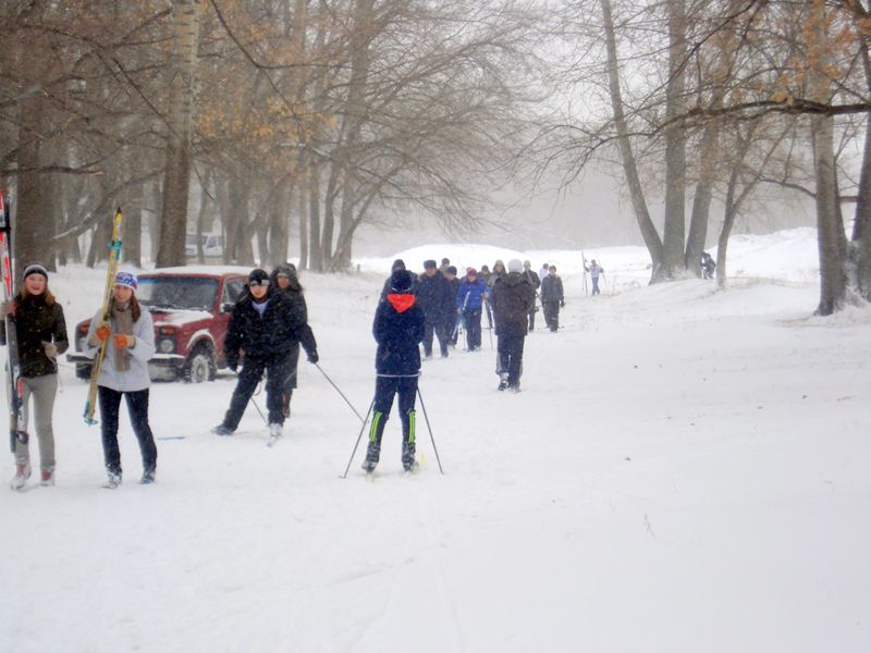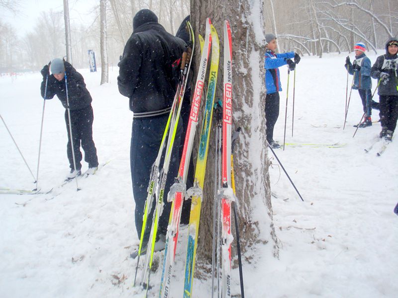 Люди прибывают. Некоторые спортсмены разогревались, раскатывали лыжи. На одном месте стоять не желательно. Подтаявший снег прилипал к лыжам. Создавались трудности.