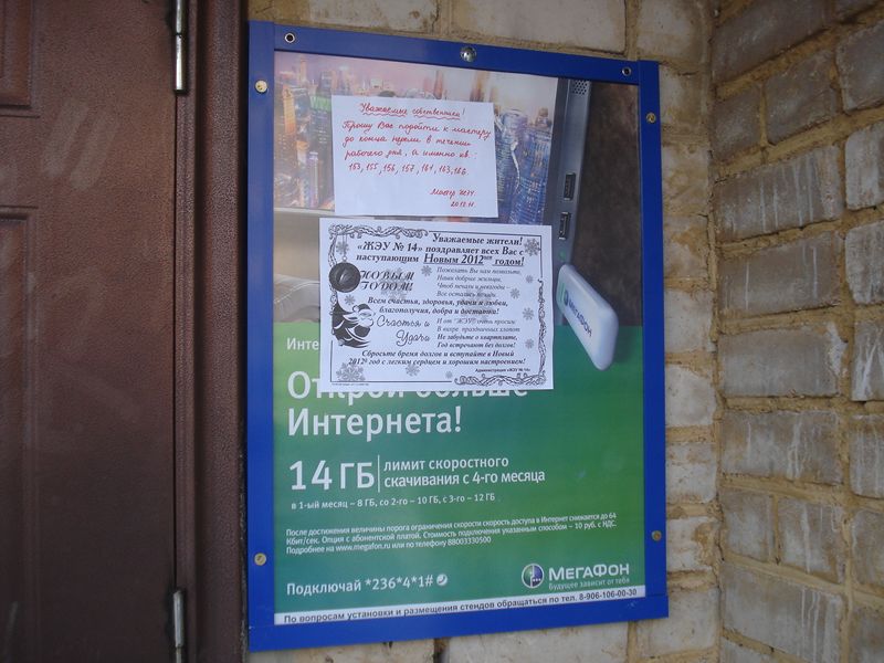 Около месяца назад на сайте была опубликована заметка о том, как реклама "Мегафона" все ближе и ближе подбирается к квартирам горожан. Они разместили рекламные щиты на стенах домов, возле входной двери.