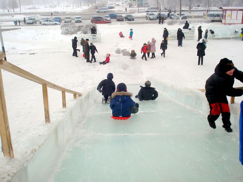 Помню, горки в детстве были гораздо больше. Или сейчас мне это только кажется. Их делали, в основном, из снега. Теперь, в качестве строительного материала, используют лед. Перила деревянные.
