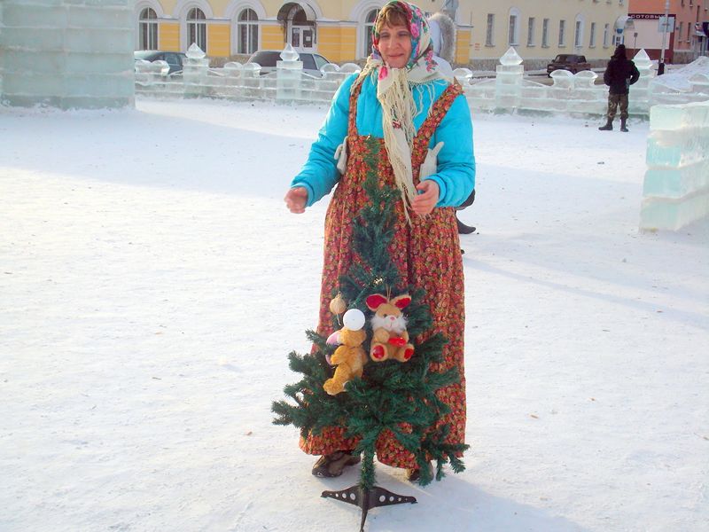 Женщина в сарафане. Так и не понятно, под кого она переоделась. Больше похоже на Бабу Ягу. Метла ей особенно подходила. Родное, привычное средство передвижение. Но и у нее не получилось взлететь.