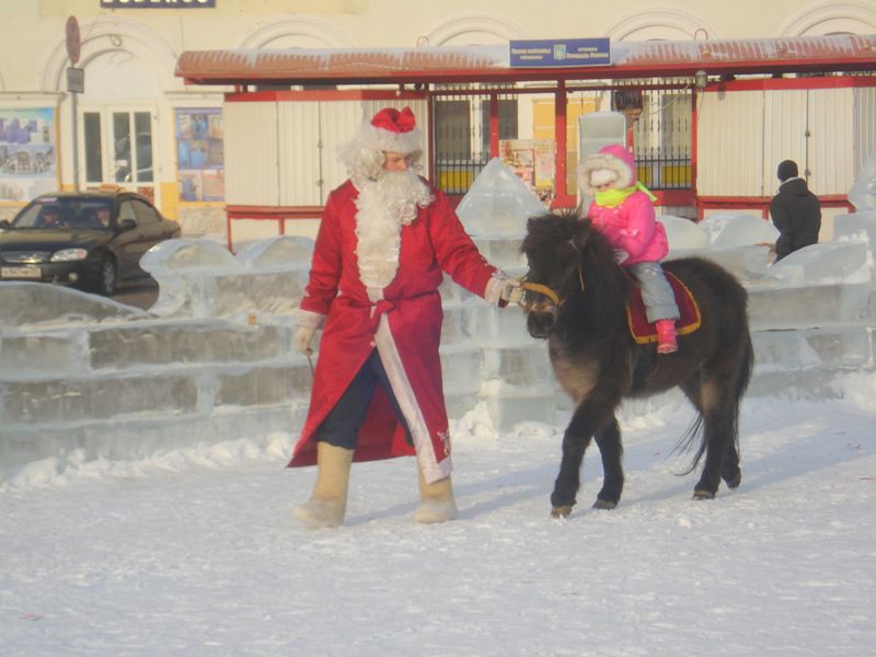 Наш корреспондент, вооружившись фотокамерой, отправился снимать, и подготовил для сайта фоторепортаж с главной площади Салавата. Вокруг ледяного городка Дед Мороз катал детишек на пони. Около телеги была лошадь по-больше, видимо, для взрослых.