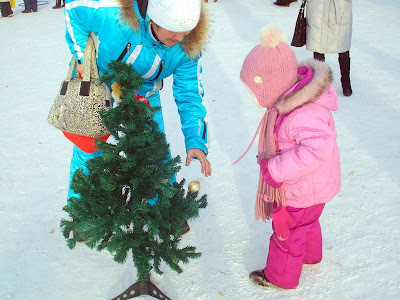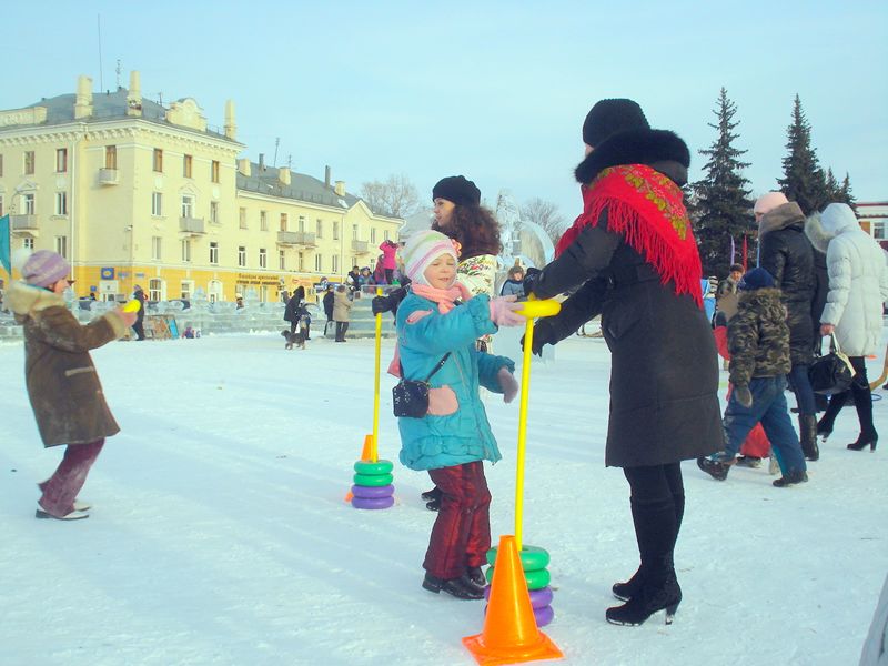 Бурлаки на площади. Только вместо кораблей тянули санки. Нужно было собрать шарики на трассе и сложить их в корзину. Один тянет, второй сидит на санях, собирает урожай.