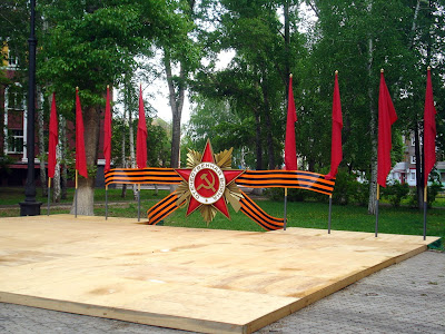 Сквер у ДК "Нефтехимик" преобразился. Повсюду висят плакаты военных лет. Установлены палатки. Была возведена сцена, оформленная тематикой Дня Победы. Ярко, красочно.