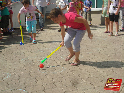 Ребятня отлично повеселилась. Они прыгали, бегали, рисовали рисунки на асфальте, играли в хоккей китайскими клюшками. Не простое это дело, однако.