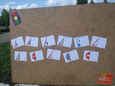 Следующая остановка - секция ПДД. Тут нужно правильно дорисовать дорожный знак. На стенде изображены лишь половинки знаков. Вторую половинку детям нужно додумать самим. Однако, практически ни у кого не возникало сложностей.