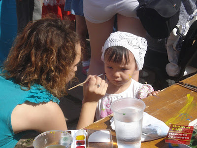 Давайте посмотрим, какие площадки были организованы для детей. А их было достаточно много. Секция "Body art". Тут тебя разукрашивали красками. Рисовали на лице, на руках, в общем, на любой части тела, которую не жалко.