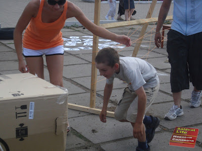 Авторы сайта уже устали перечислять все площадки. Впереди еще много чего интересного. Видите, какой масштабный праздник. Что же, идем дальше. Следующая секция - полоса препятствий. Ребятам нужно было пройти через лабиринт. Пробраться сквозь паутину и пробежать через длинную, картонную коробку.